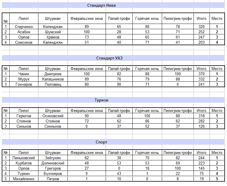 Публикуем промежуточные результаты экипажей (после четырёх этапов), выступающих в Чемпионате юга России по трофи-рейдам 2010 года, в зачётных категориях «стандарт», «туризм» и «спорт». Обращаем ваше внимание на две группы в категории «стандарт» - это разделение автомобилей по типу передней подвески. Зачётные группы получили, в этом году, названия «стандарт - Нива» и «стандарт - УАЗ», хотя вместе с автомобилями отечественного производства в этих зачётах выступают и собранные за рубежом.