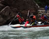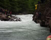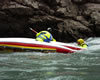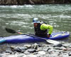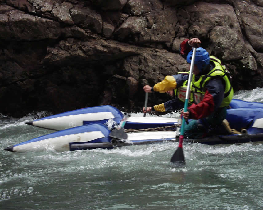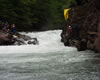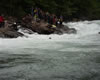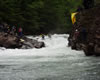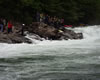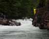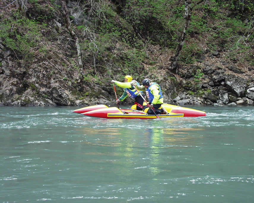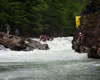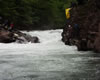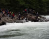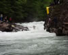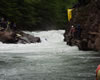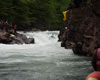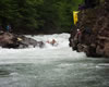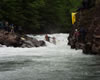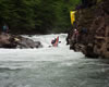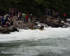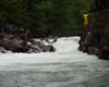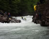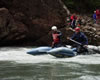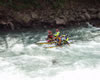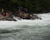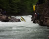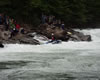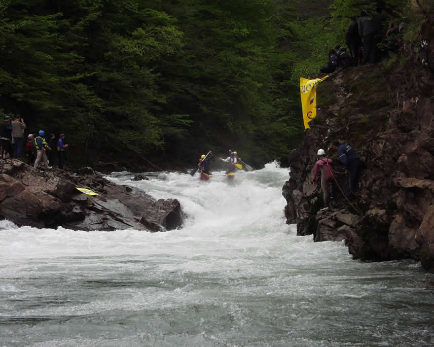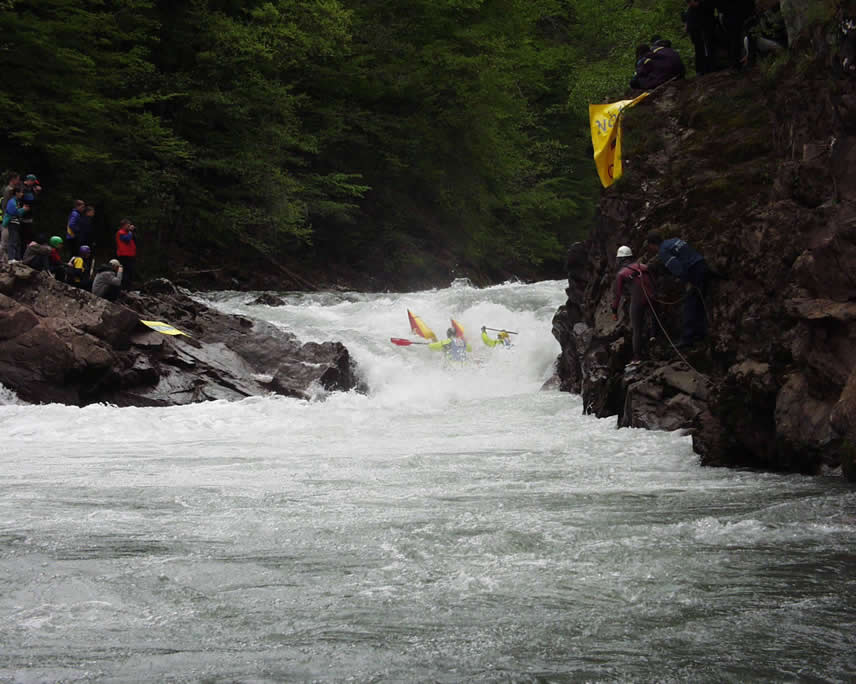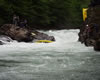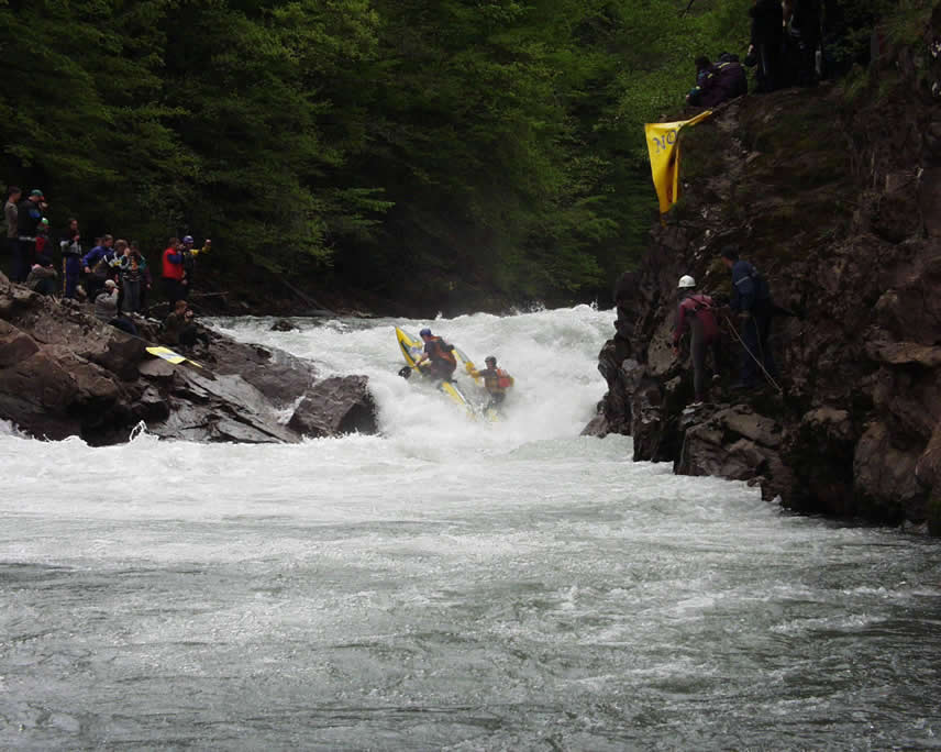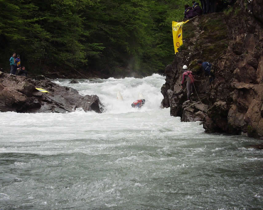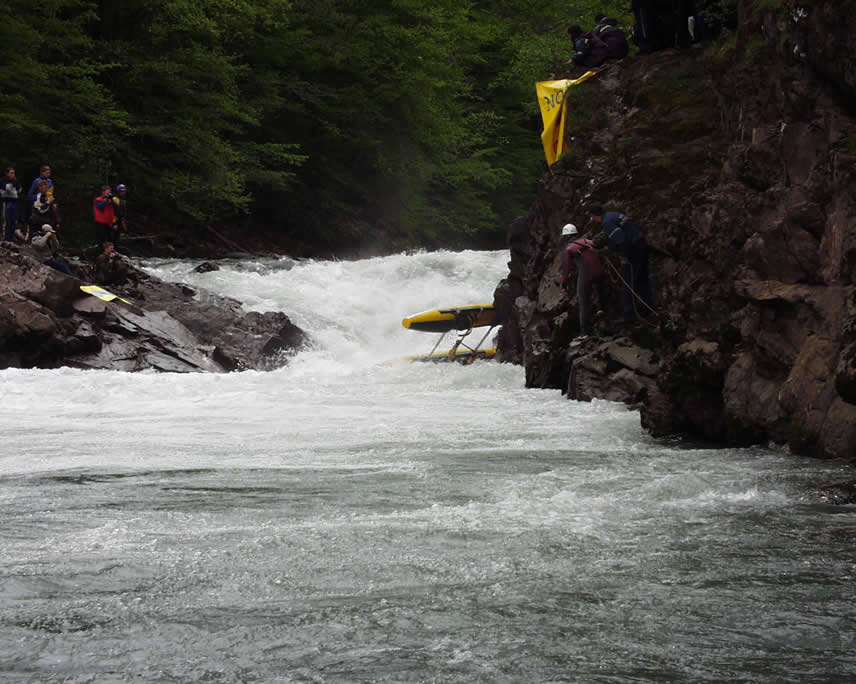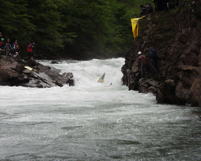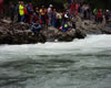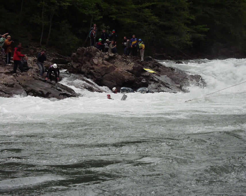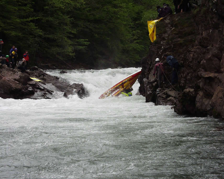 На фотографиях один из самых красивых моментов Интерралли. Этап, который заканчивался прохождением порога Топоры. Воды в ходе соревнований было несколько меньше, чем обычно - как следствие, слив стал жёстче. Из восьми катамаранов лишь одному экипажу на "двойке" удалось пройти препятствие без аварии. Они подкрались вплотную под правым берегом, перед самым сливом зацепили скальный выступ и в Топоры свалились лагом - совсем неправильно, казалось бы. Однако, случайно или нет, но прошли (фото P5020117.jpg). У остальных, даже у "четвёрок" (фото P5020076.jpg), шансов было столько же. Но им не повезло. Ещё две "двойки" сам порог обнесли - в первую очередь, жалея суда, поломка которых иногда может выбить из дальнейших состязаний. Здесь показателен пример двух экипажей, один из которых пошёл на обнос, а второй, появившись через минуту, сверзился в Топоры. Первый ещё возился на берегу (фото P5020098.jpg), в то время как соперники успели перевернуться (фото P5020109.jpg), поставить судно на ровный киль и уйти к финишу. Последними шли два каякера - один пролетел молниеносно, с трудом поднялся и бодро погрёб дальше. Второй (фото P5020123.jpg) исчез на семнадцать секунд вместе с каяком. Публика замерла. За моей спиной девушка отчётливо простонала: "Да сделайте же что-нибудь!" Тут выбросило наверх одновременно каяк по частям и гребца, целым и в сознании (фото P5020129.jpg).