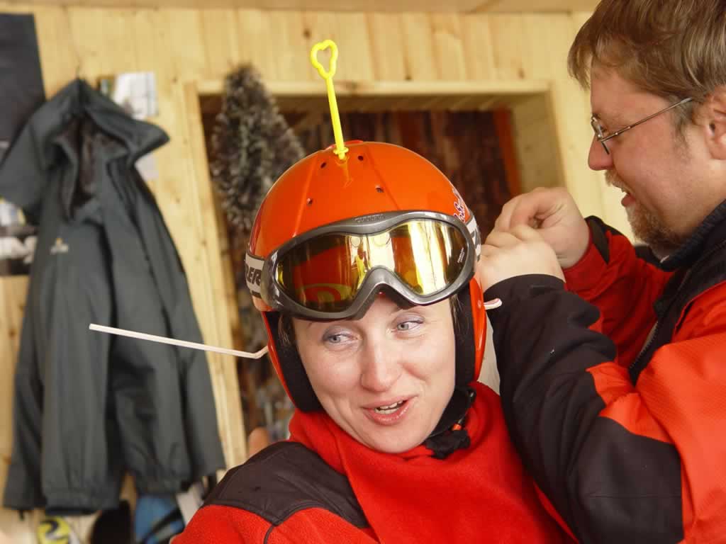 смеётся на лыжником |