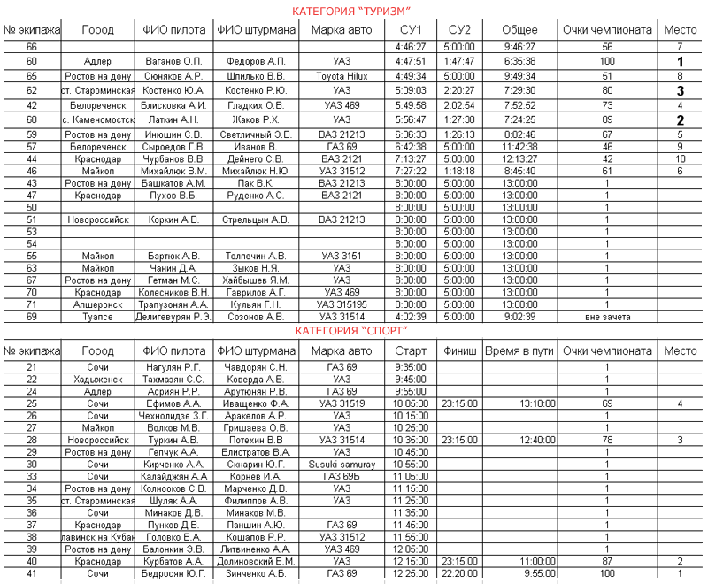 Публикуем официальные результаты первого этапа Чемпионата юга России по трофи-рейдам. Соревнования прошли в районе поселка Каменномостский республики Адыгея, с 23 по 25 февраля 2007 года. Таблица результатов представлена в графическом формате, вес картинки - 120 килобайт. Смотреть здесь.