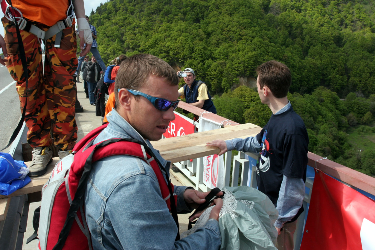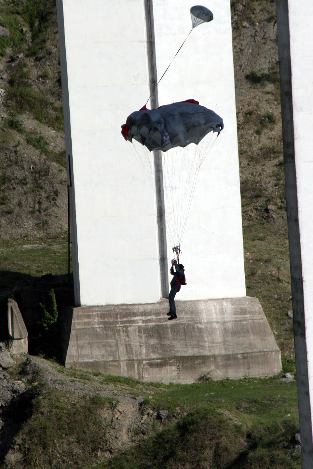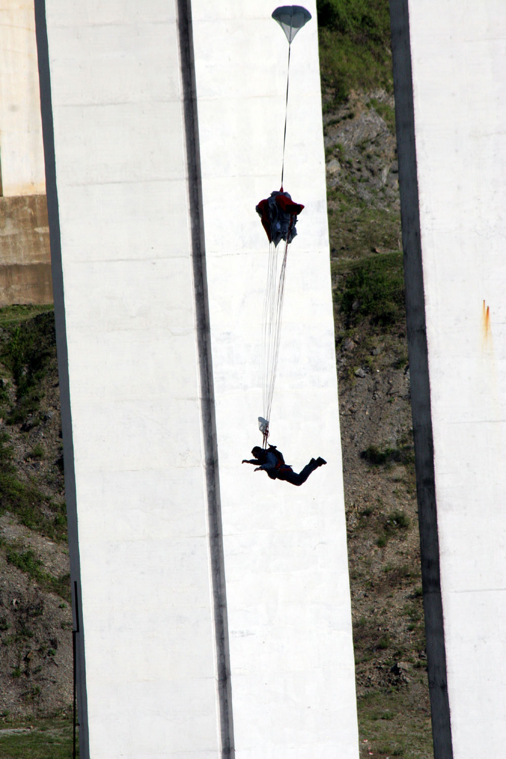 Прыгают одновременно двое. Анис уходит чуть раньше. В этом есть свой смысл - меньше шансов помешать друг другу. Однако, тот, кто идёт вторым, запросто может "сесть" на купол нижнего. Поэтому сразу после раскрытия пилоты стараются уходить в сторону. Впрочем, пространства под мостом столько, что выбирать место посадки особенно не приходится.