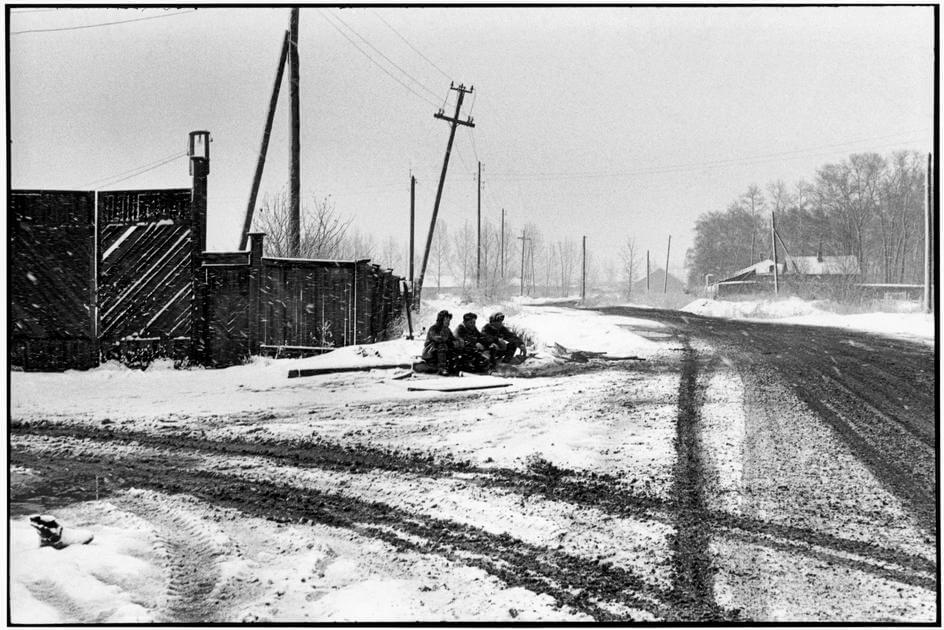 На фотографии — трое мужчин на остановке общественного транспорта, в городе Иркутске. Снимок сделан в 1972 году, автор — Анри́ Картье́-Брессо́н — французский фотограф, выдающийся мастер реалистичной фотографии XX века, фотохудожник, один из основоположников фоторепортажа и фотожурналистики.