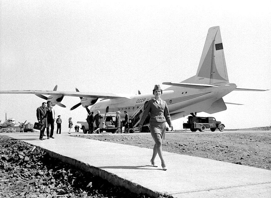40 лет назад, в городе Мирном, Якутской АССР, открыли новую взлётно-посадочную полосу, которая позволила принимать самолёты дальней авиации. На снимке неизвестного автора запечатлён момент прибытия в Мирный борта «СССР–11199». Первая посадка среднемагистрального пассажирского самолёта «Ан-10» состоялась в торжественной обстановке. Для крохотного городка, затерянного в якутской лесотундре, это стало действительно большим событием. Никакой транспортной связи с материком, кроме авиационного сообщения, в те годы для жителей Мирного не существовало.