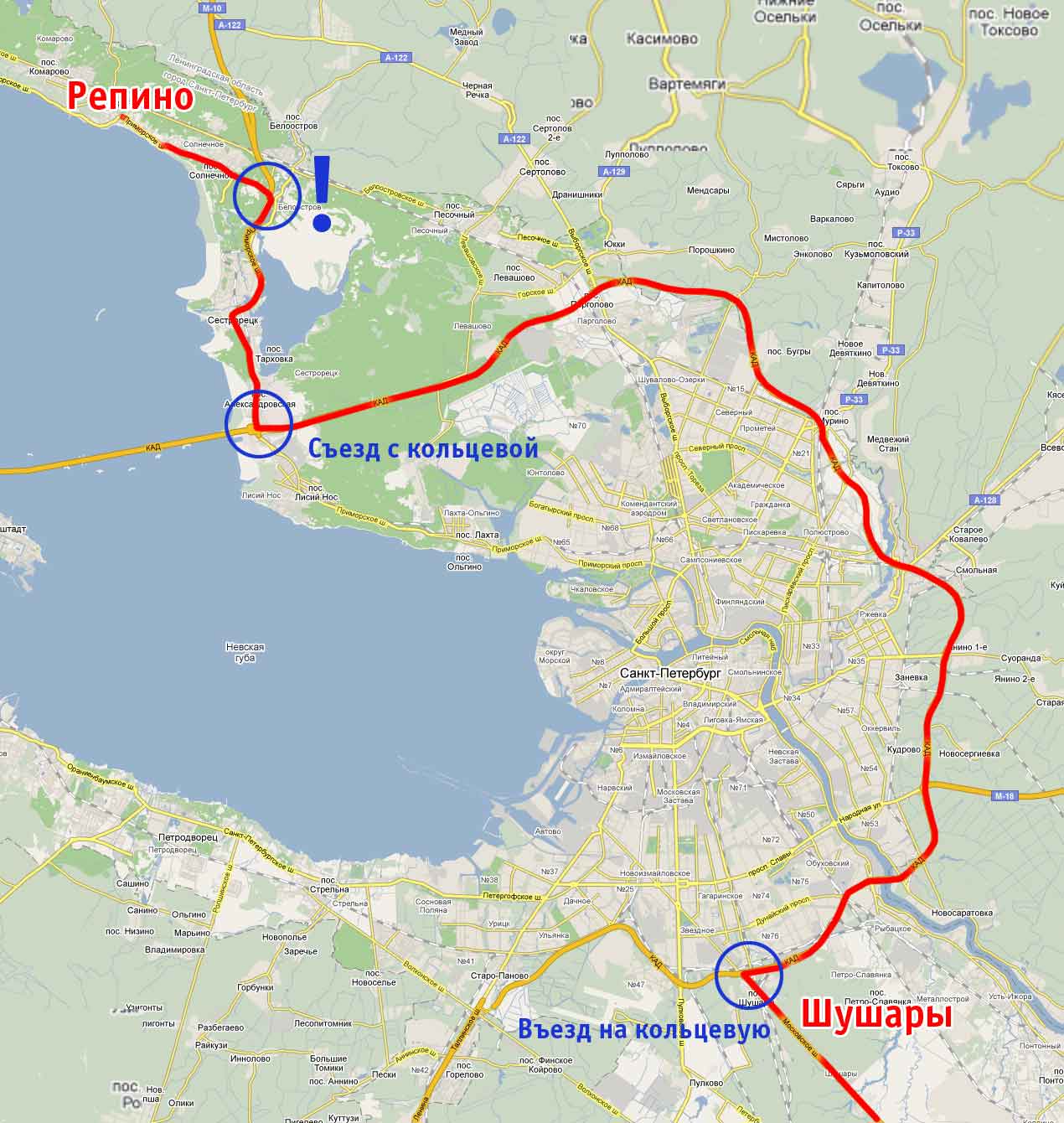 Вначале съезжаем с кольцевой (КАД) по указателю "Приморское шоссе" НАПРАВО, сбросив скорость до 70-80 км\час и плавно беря правее и правее оказываемся на Приморском шоссе, но - едем по направлению в Питер. Внимание! НЕ ПЕРЕСТРАИВАЕМСЯ НАЛЕВО, а прижимаемся правее, после 100-120 м. будет снова заезд направо, на КАД - ИГНОРИРУЕМ - ЕДЕМ ПРЯМО! Еще через 100-150 м. ВТОРОЙ ПОВОРОТ НАПРАВО приведет нас на виадук, по которому мы развернемся на 180 градусов и ЕДЕМ в РЕПИНО.