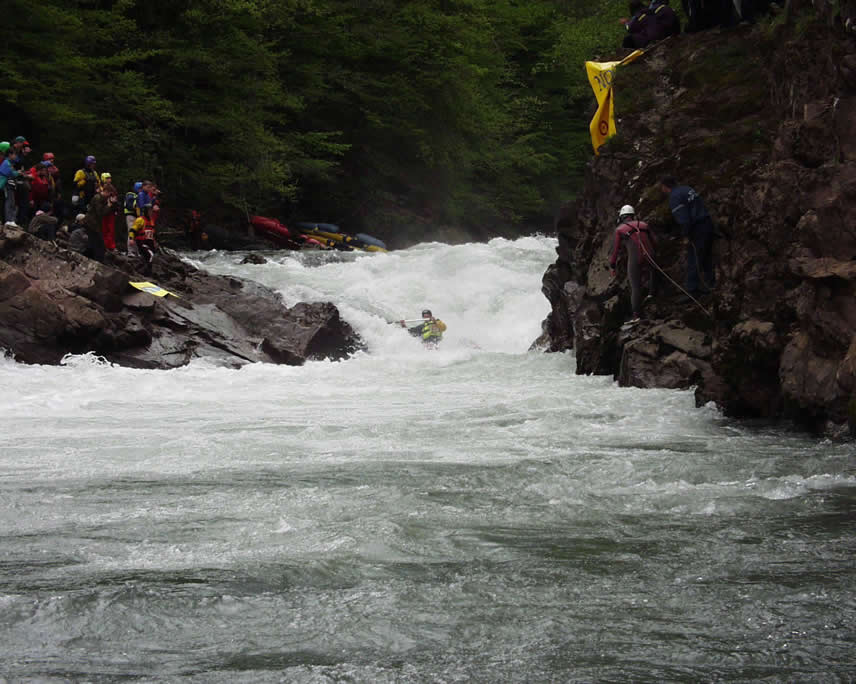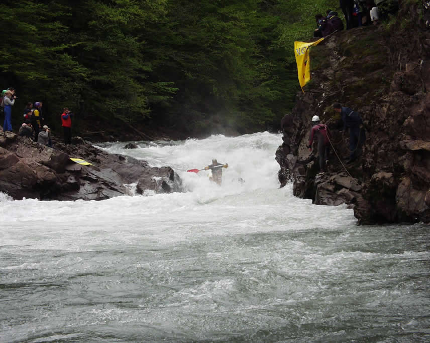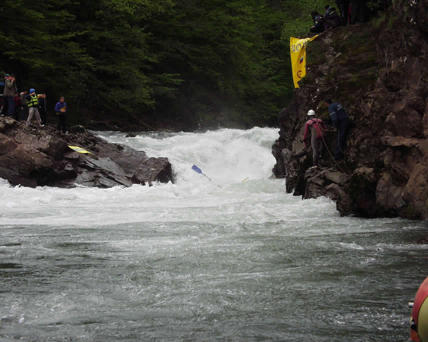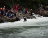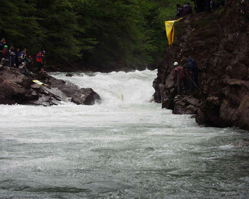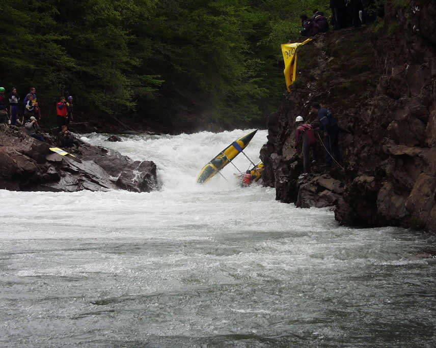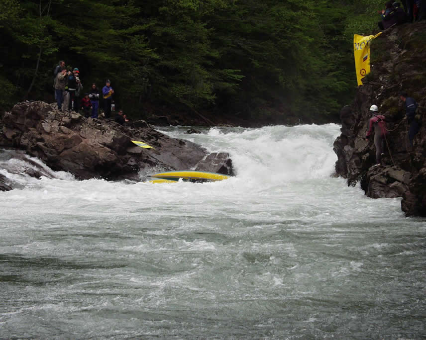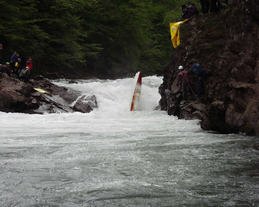 На фотографиях один из самых красивых моментов Интерралли. Этап, который заканчивался прохождением порога Топоры. Воды в ходе соревнований было несколько меньше, чем обычно - как следствие, слив стал жёстче. Из восьми катамаранов лишь одному экипажу на "двойке" удалось пройти препятствие без аварии. Они подкрались вплотную под правым берегом, перед самым сливом зацепили скальный выступ и в Топоры свалились лагом - совсем неправильно, казалось бы. Однако, случайно или нет, но прошли (фото P5020117.jpg). У остальных, даже у "четвёрок" (фото P5020076.jpg), шансов было столько же. Но им не повезло. Ещё две "двойки" сам порог обнесли - в первую очередь, жалея суда, поломка которых иногда может выбить из дальнейших состязаний. Здесь показателен пример двух экипажей, один из которых пошёл на обнос, а второй, появившись через минуту, сверзился в Топоры. Первый ещё возился на берегу (фото P5020098.jpg), в то время как соперники успели перевернуться (фото P5020109.jpg), поставить судно на ровный киль и уйти к финишу. Последними шли два каякера - один пролетел молниеносно, с трудом поднялся и бодро погрёб дальше. Второй (фото P5020123.jpg) исчез на семнадцать секунд вместе с каяком. Публика замерла. За моей спиной девушка отчётливо простонала: "Да сделайте же что-нибудь!" Тут выбросило наверх одновременно каяк по частям и гребца, целым и в сознании (фото P5020129.jpg).