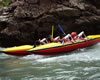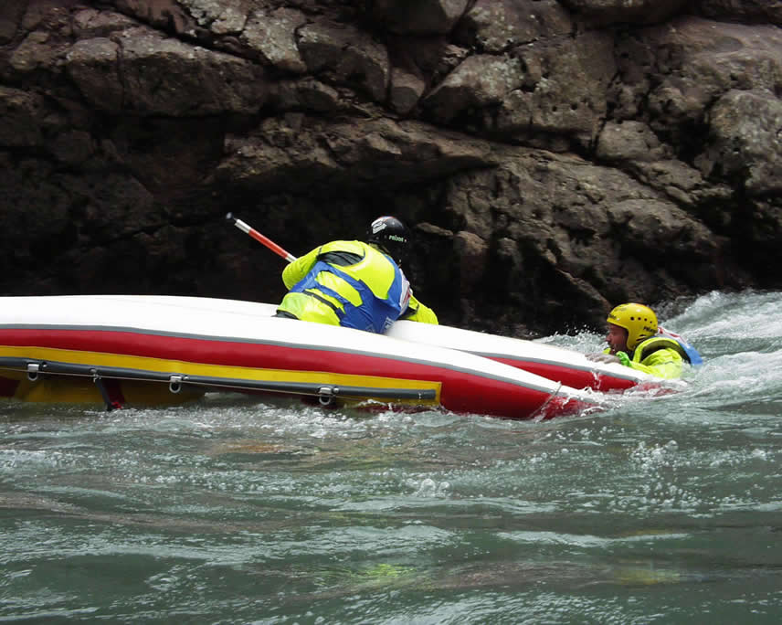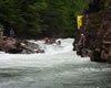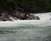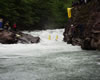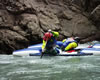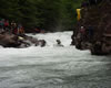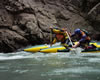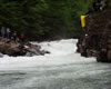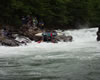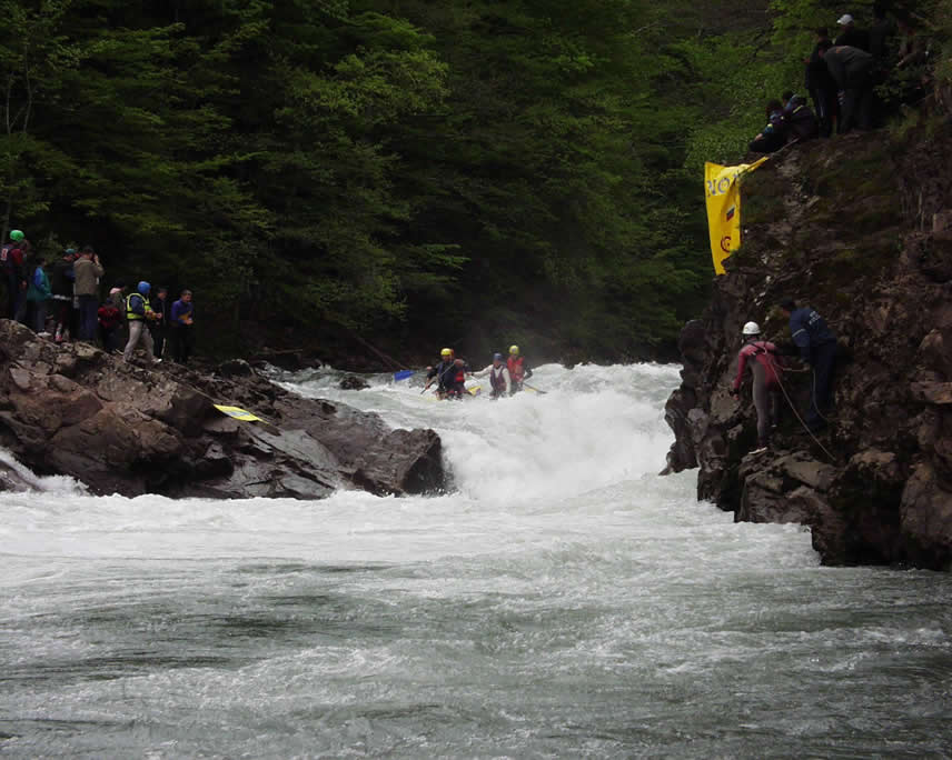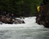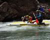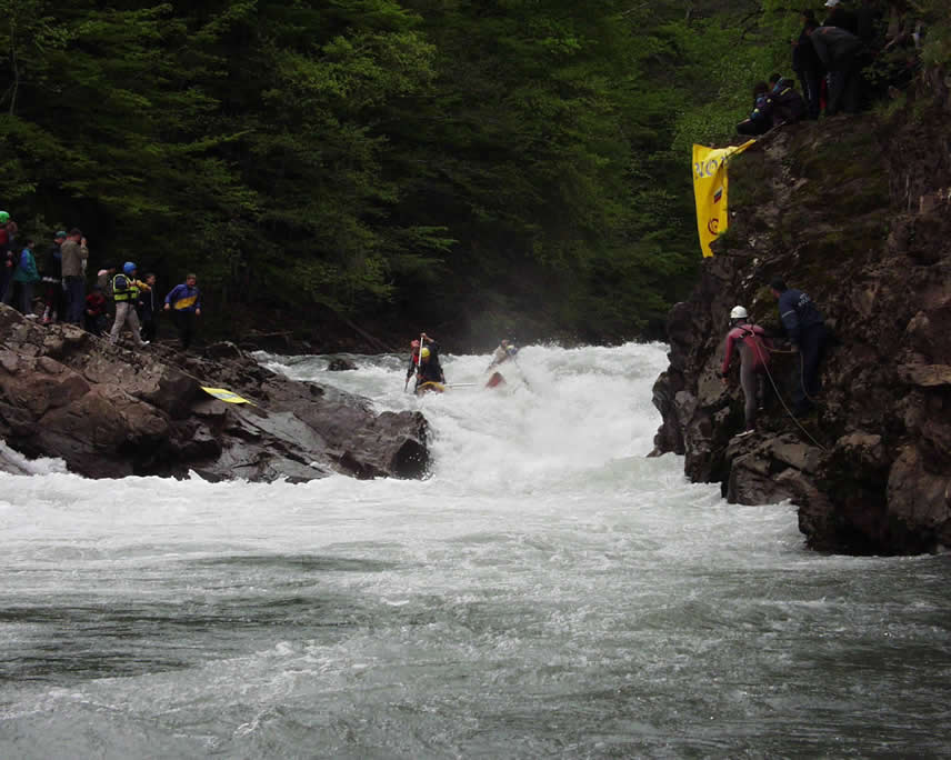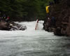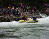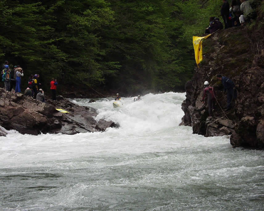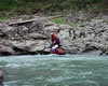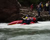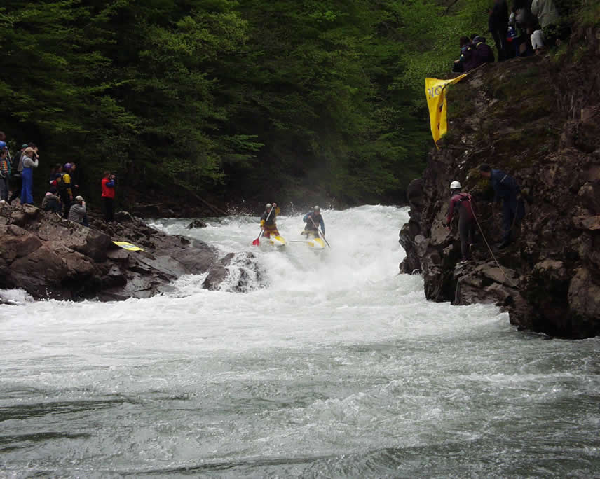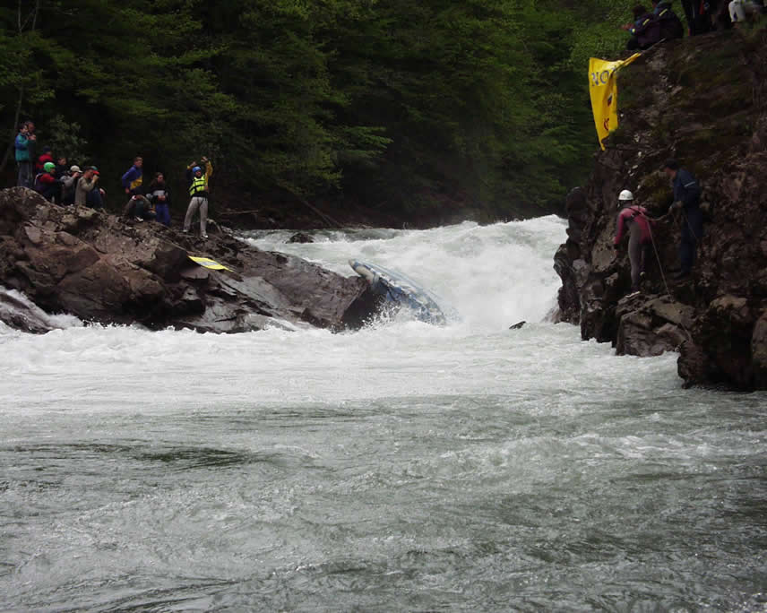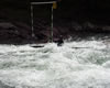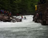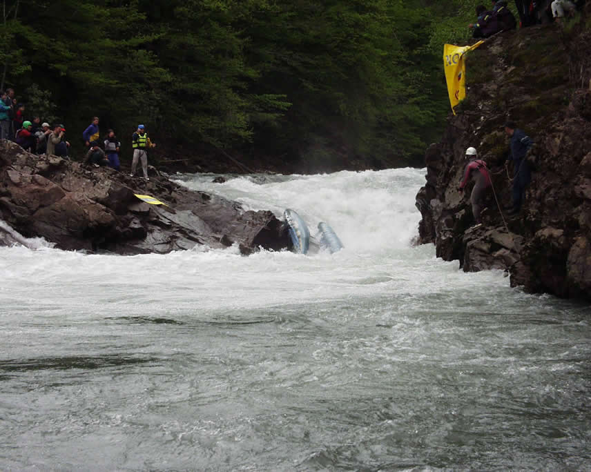 На фотографиях один из самых красивых моментов Интерралли. Этап, который заканчивался прохождением порога Топоры. Воды в ходе соревнований было несколько меньше, чем обычно - как следствие, слив стал жёстче. Из восьми катамаранов лишь одному экипажу на "двойке" удалось пройти препятствие без аварии. Они подкрались вплотную под правым берегом, перед самым сливом зацепили скальный выступ и в Топоры свалились лагом - совсем неправильно, казалось бы. Однако, случайно или нет, но прошли (фото P5020117.jpg). У остальных, даже у "четвёрок" (фото P5020076.jpg), шансов было столько же. Но им не повезло. Ещё две "двойки" сам порог обнесли - в первую очередь, жалея суда, поломка которых иногда может выбить из дальнейших состязаний. Здесь показателен пример двух экипажей, один из которых пошёл на обнос, а второй, появившись через минуту, сверзился в Топоры. Первый ещё возился на берегу (фото P5020098.jpg), в то время как соперники успели перевернуться (фото P5020109.jpg), поставить судно на ровный киль и уйти к финишу. Последними шли два каякера - один пролетел молниеносно, с трудом поднялся и бодро погрёб дальше. Второй (фото P5020123.jpg) исчез на семнадцать секунд вместе с каяком. Публика замерла. За моей спиной девушка отчётливо простонала: "Да сделайте же что-нибудь!" Тут выбросило наверх одновременно каяк по частям и гребца, целым и в сознании (фото P5020129.jpg).