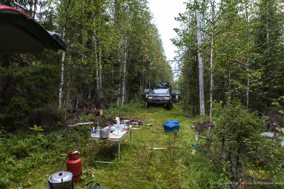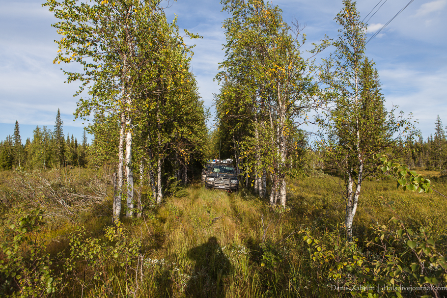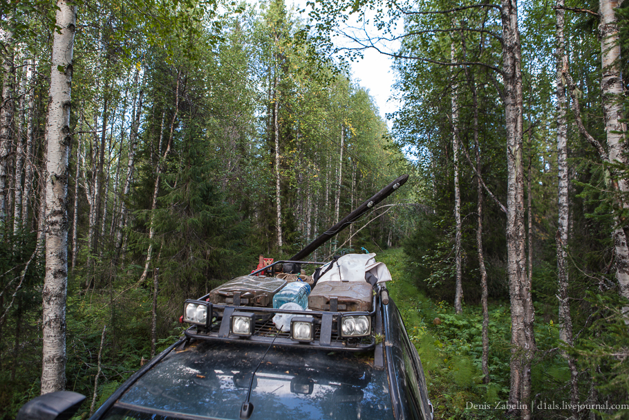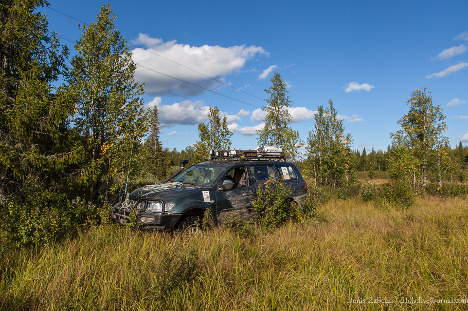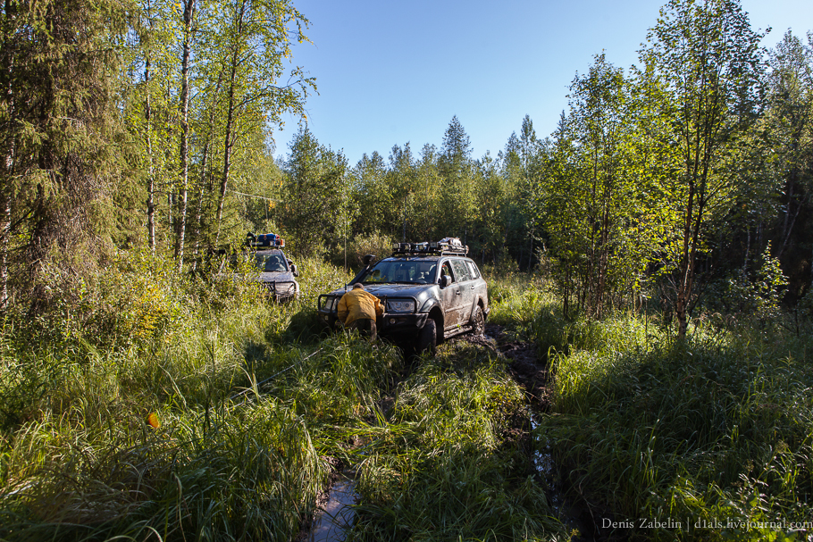 В таких местах, приходится делать небольшой крюк, прокладывая свой объезд открытой воды, метр за метром, шаг за шагом, используя сендтраки и фантазию. Интересно, но процесс езды по моховому болоту очень сильно напоминает топтание зимника – неверная работа с газом, приводит к мучительным упражнениям с лебедкой. Странно, но одновременно замечаем, что практически полностью пропали грибы, дичь и не стало следов зверей. Какие-то странные места, несмотря на высоту под 300 метров, тайга как - будто спит. Размышляем о дальнейших перспективах. Вся надежда теперь, что лебедки не подведут. Пройдено около 20 км, до Борковской остается ещё примерно столько же.