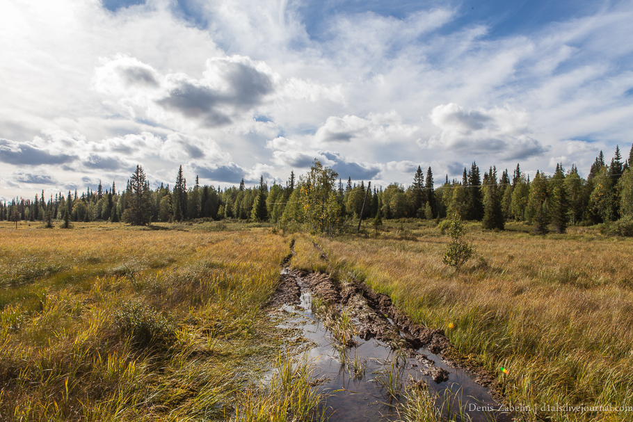 Тракт в этих местах пересекает бесчисленное количество красивых ковровых болот. Потрясающе яркое северное небо вкупе с желтыми цветами осени бесподобно.