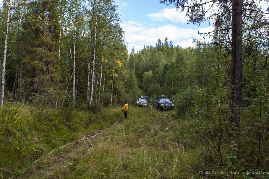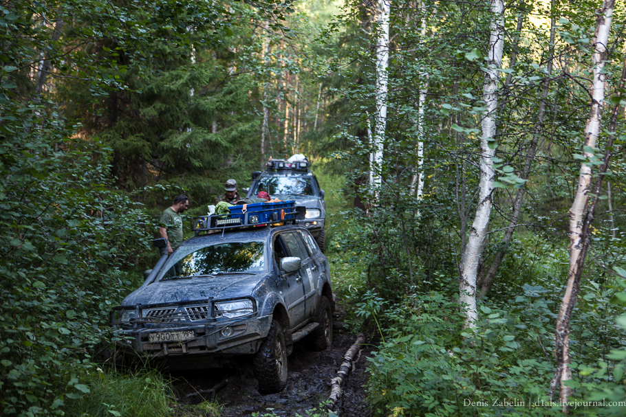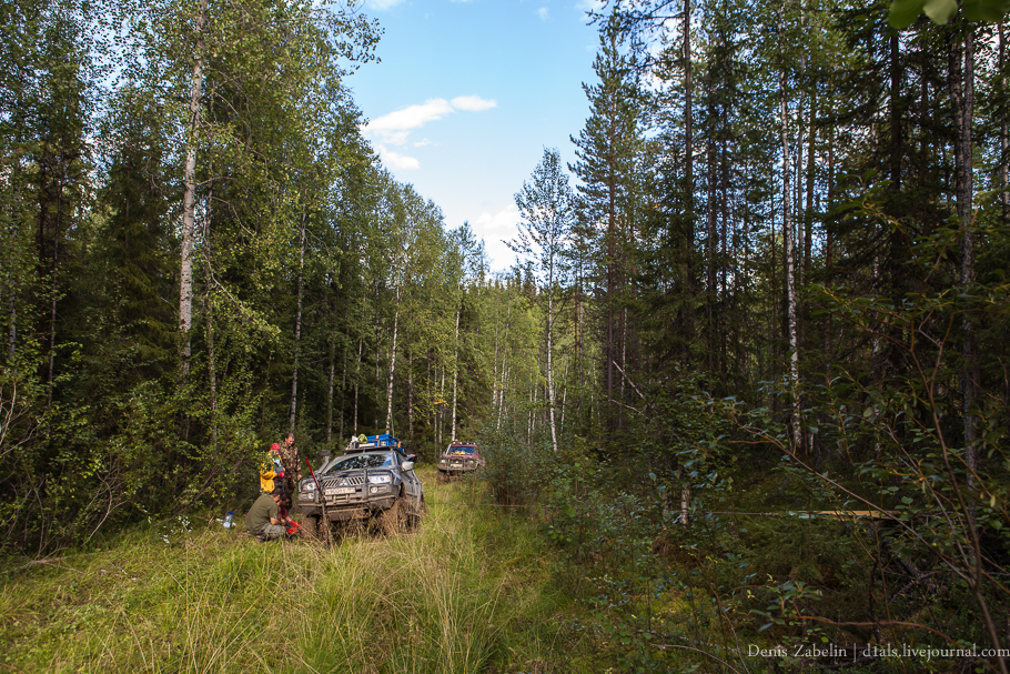 Тракт изобиловал огромным количеством звериных ловушек. Очевидно, что местные жители активно промышляют охотой. Появились первые засадные места, где мы, начали подсаживаться. Моя машина шла первой, Олег вторым и завершал колонну Андрей на Патруле. Такая конфигурация позволяла нам двигаться по ещё не разбитому тракту, где-то проходя ходом, где-то в разрез. Здесь проявились первые особенности техники прохождения тракта не совсем укладывающиеся в мое обычное понимание. Учитывая, что колея была разбита под 35"-37" колеса, мы физически не могли идти по колее, плотно цепляясь мостом и защитой за грунт. А на давлении 0.8-1.0 атм., мы не могли уже идти и по колее и под 33" колеса, плотно цепляюсь уже всеми агрегатами в проходных местах с твердым дном. Пришлось комбинировать варианты и идти на компромиссном давлении в 1,2-1,3 атмосферы, которое позволяло многие места брать ходом.
