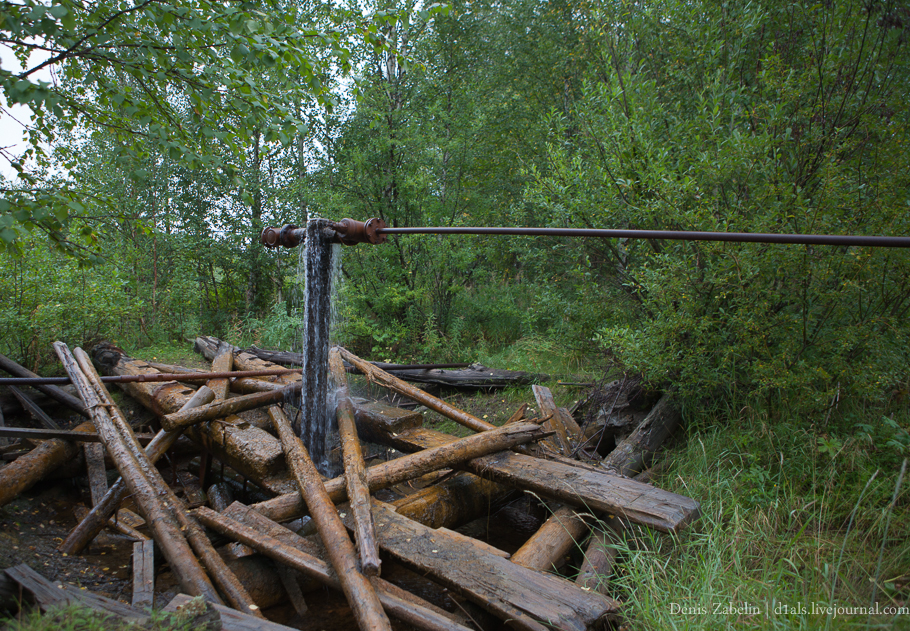 О бурной деятельности геологов напоминают вот такие законсервированные скважины, из которых, несмотря на консервацию прорывается солёная вода, стекая журчащими потоками в Сулу