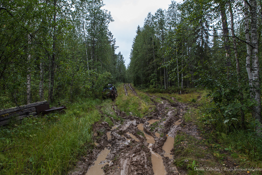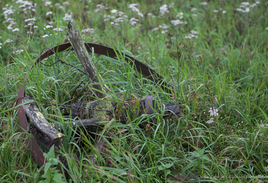 Практически весь день идёт мерзкий дождь, мы уже давно мокрые насквозь. А ведь даже совсем небольшой дождь превращал глину в очень очень скользкую мыльную субстанцию. В сухую погоду - это отличный твердый грунт по которому без проблем получается идти в разрез колеи.  Находим брошенные волокуши, когда-то здесь был зимник.