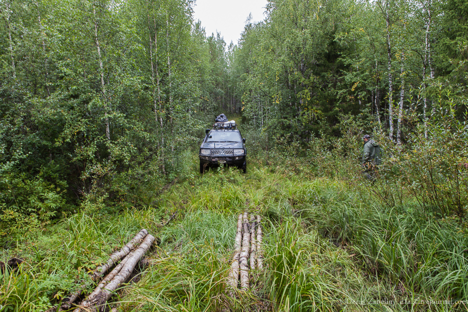 Запрашиваем прогноз погоды – ближайшие 5-7 дней дожди. Неспокойные и тревожные предчувствие одолевают меня, со стороны Нижнесульской начинаются глиняные спуски и подъемы, что для нашей резины практически испытание. Добираемся до избы Бобрецова, опять следы борьбы Patrol с чёрной грязью. Остатки гати вырваны из болота, до дна не достаем.