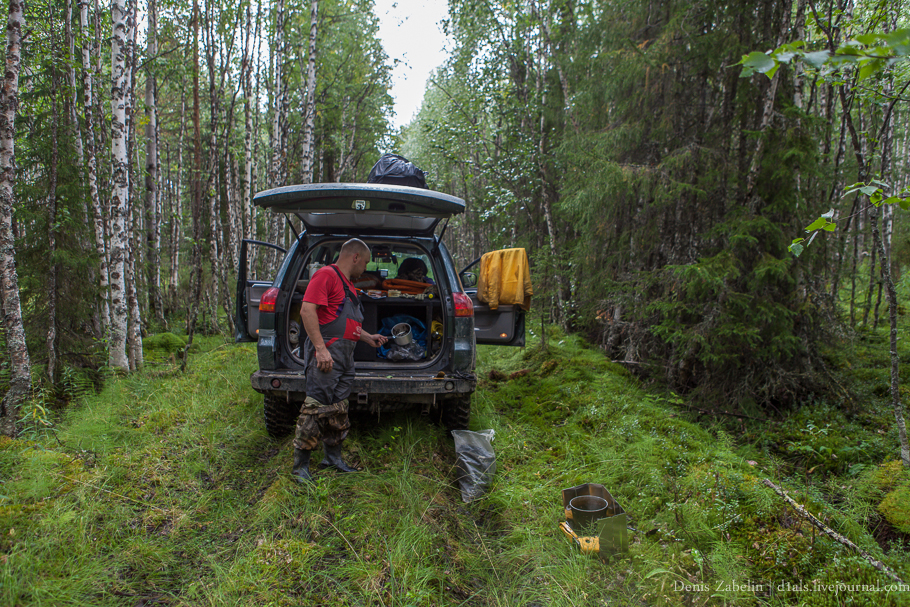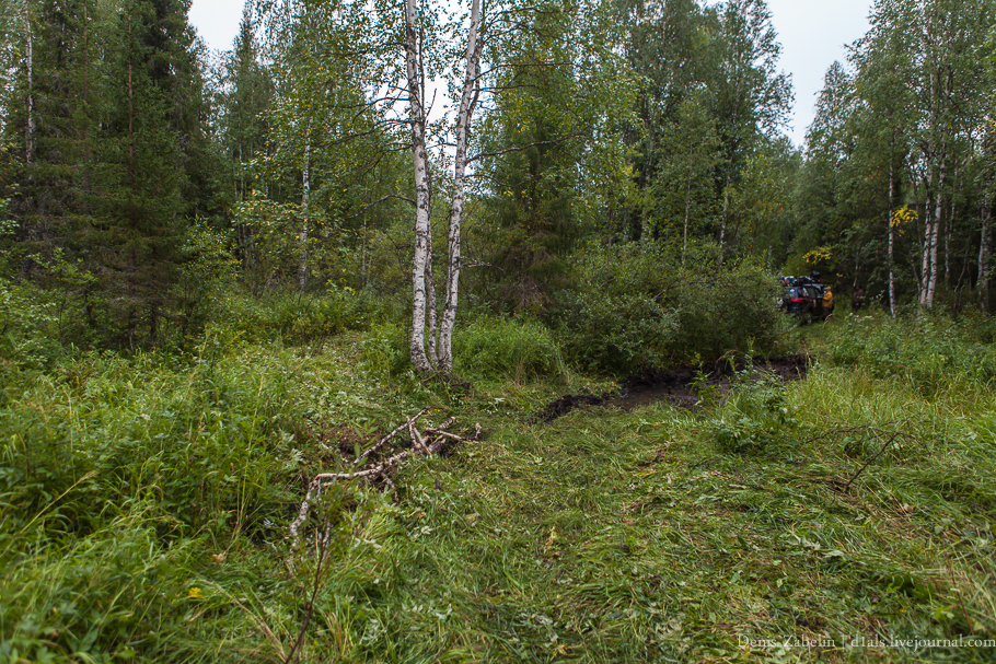 Первый раз пересекаем Лиственничную Валсу и после тяжелого подъема на первые отроги кряжа становимся очередным лагерем. Тайга здесь сырая и мрачная. С трудом находим сухостой для костра. Ну, право не телеграфные же столбы валить. Машины начали по – немного разгружаться, чувствуется уже не только визуально. Отдыхаем и сушим одежду с обувью, промокшую за день. Настроение немного улучшается, скорость передвижение увеличилась. Ещё надеемся, что ребята нас ждут на Борковской, пытаясь понять по следам, насколько они нас опережают. Скорее всего, на сутки. Пройдено 16 км
