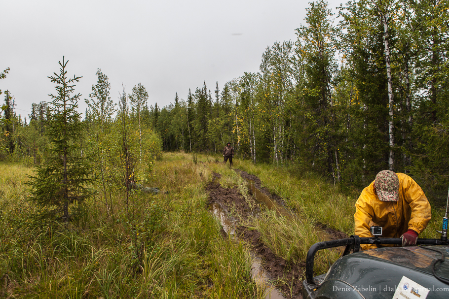 Периодически видим следы борьбы Patrol, неудивительно, ребята предпочитают идти на заднем приводе для экономии топлива и минимизации нагрузки на передний кардан, все – же автомобиль является гибридом Patrol и УАЗа. Нам же в таких местах приходится нелегко, разбитый грунт серьезно осложняет передвижение, машины вязнут в болотистой каше.